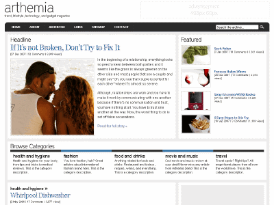 This is actually v2.0 of the great magazine WordPress theme Arthemia. There are changes in the post list on the front page, some CSS fixes, new thumbnail feature for post list on the front page, archive, and search pages, modified comment list style, and added the WP-PageNavi plugin support. Pages and sub-pages in the top navigation bar are now shown automatically.