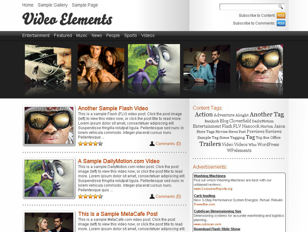 This theme comes with a fully integrated and customized version of “mediabox” developed by Iaian7. Click on a thumbnail and the video of your choice is launched in a full screen “ajax” window. Currently, this feature supports several video formats including YouTube, Google Video, MetaCafe, DailyMotion, FLV (Flash) Video, Quicktime and Windows Media Video.